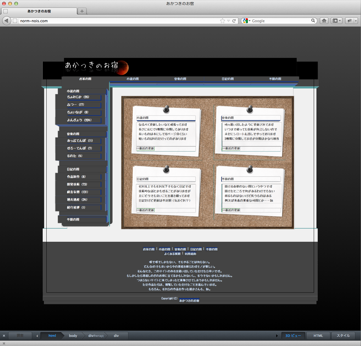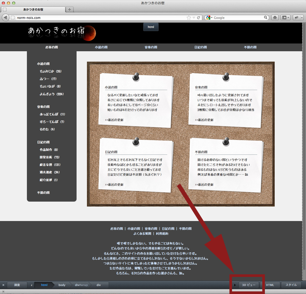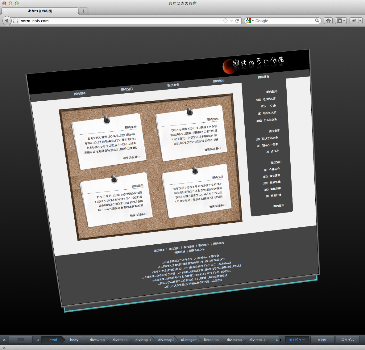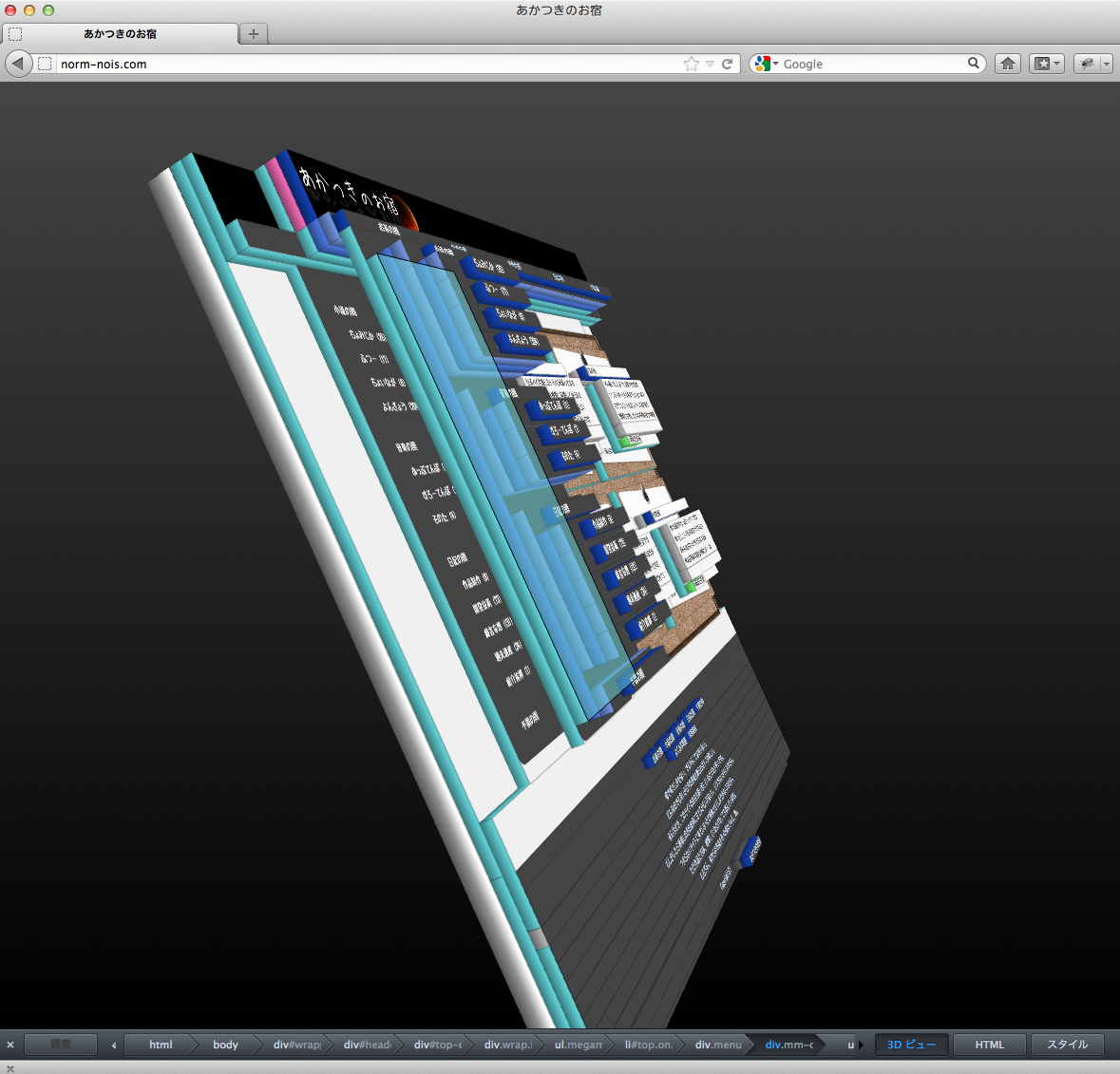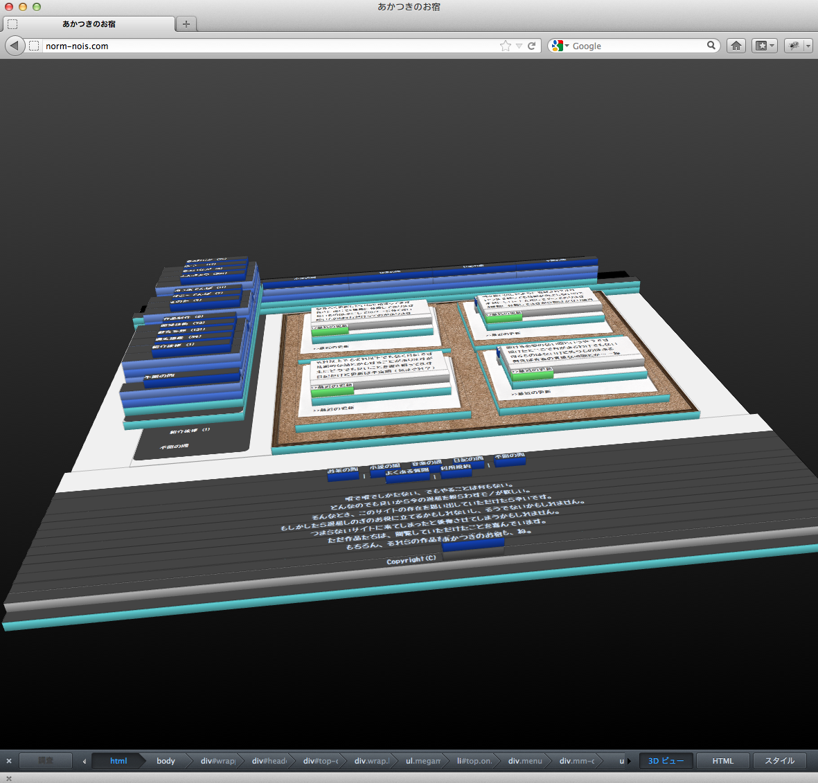 でもいずれにしても勉強にはなるかもですね。Flashコンテンツを埋め込んだ部分にz-indexが効かないんだけどぉ……っていう経験をしたことがある人もいると思うんですが、この3Dビューでそのページを見てみたら、動画が立体の一番上に来ていたりして、なるほどなーって思えるかもしれない。