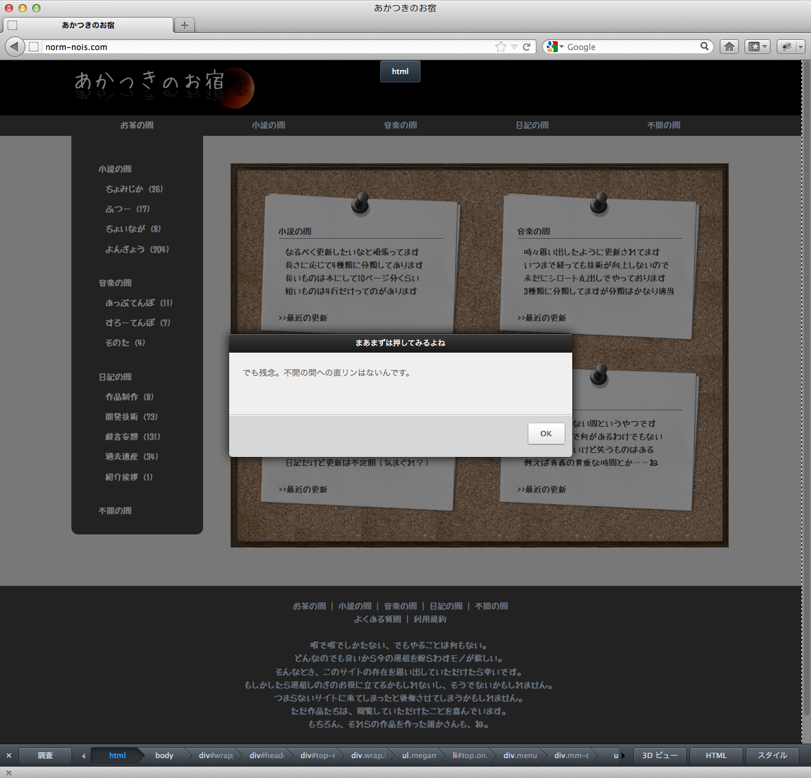 ウェブサイトを見ていると、ときどきフロート画面を使ったページがありますね。あかつきのお宿にもあります。不開の間のリンクを押したりすると、画面が薄暗くなって、アラート画面が出ます。