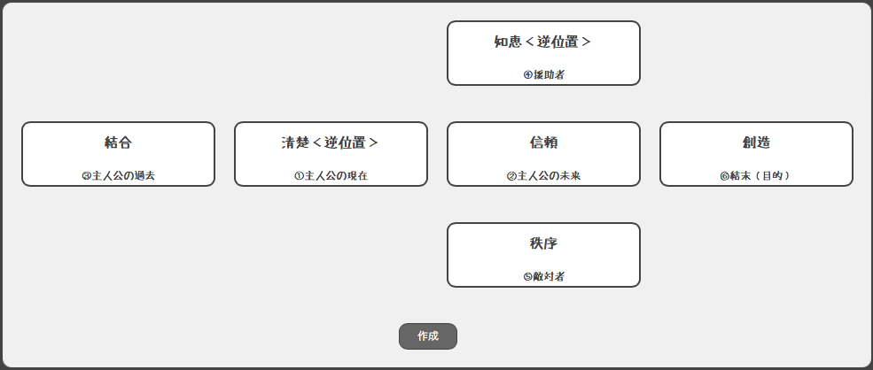 ここでやりたいことは、それぞれの状況(現在とか過去とか)に該当する単語を当てはめて、物語のプロットを考えてみようということです。