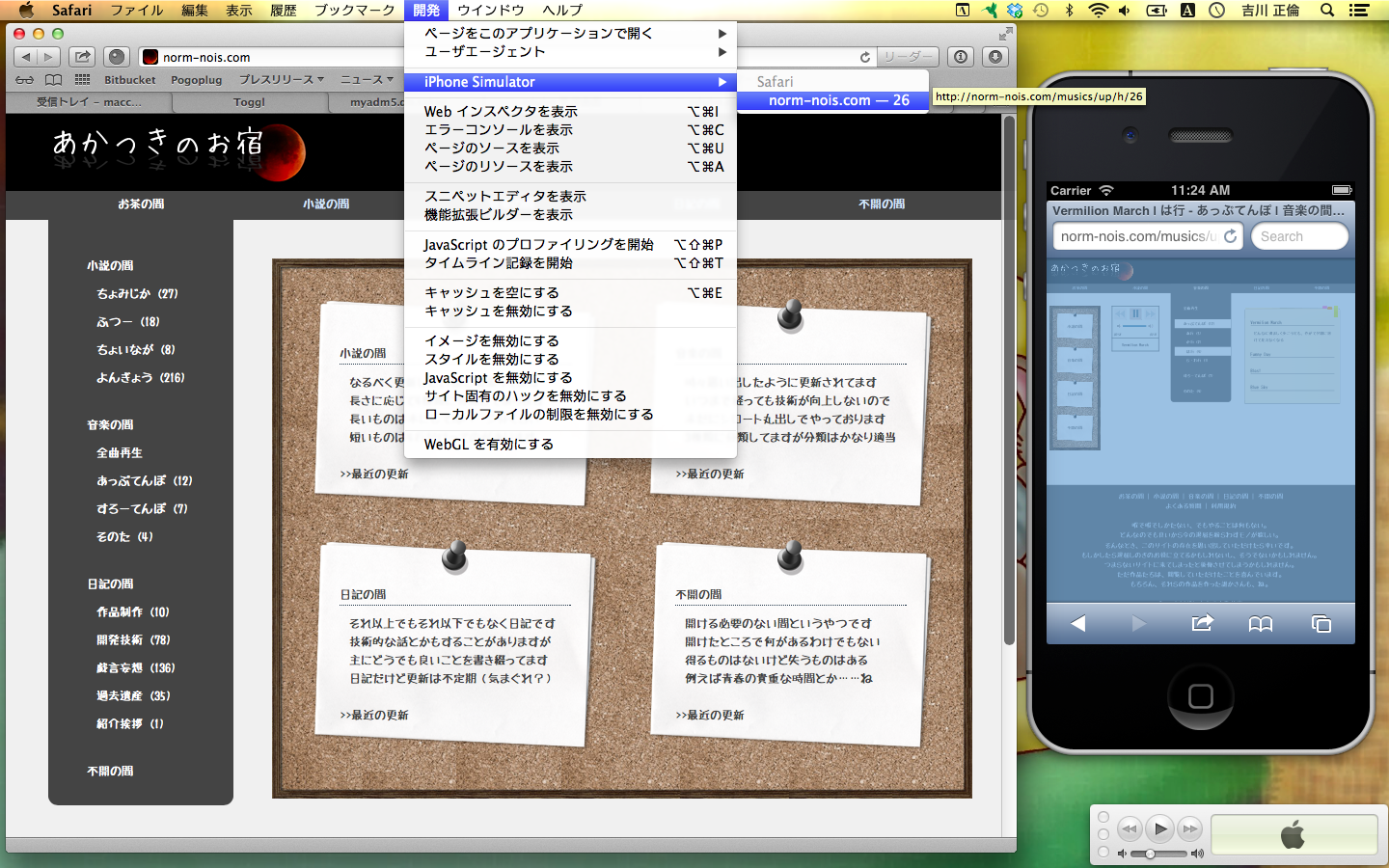 iOSシミュレータでSafariを立ち上げていると、この開発メニューの中に「iPhone Simulator」って項目が出てくるんですよ。ここにカーソルを持ってくと、今シミュレータの方で開いてるページのURLが出てくるから、それを選べばインスペクタが出てくる。