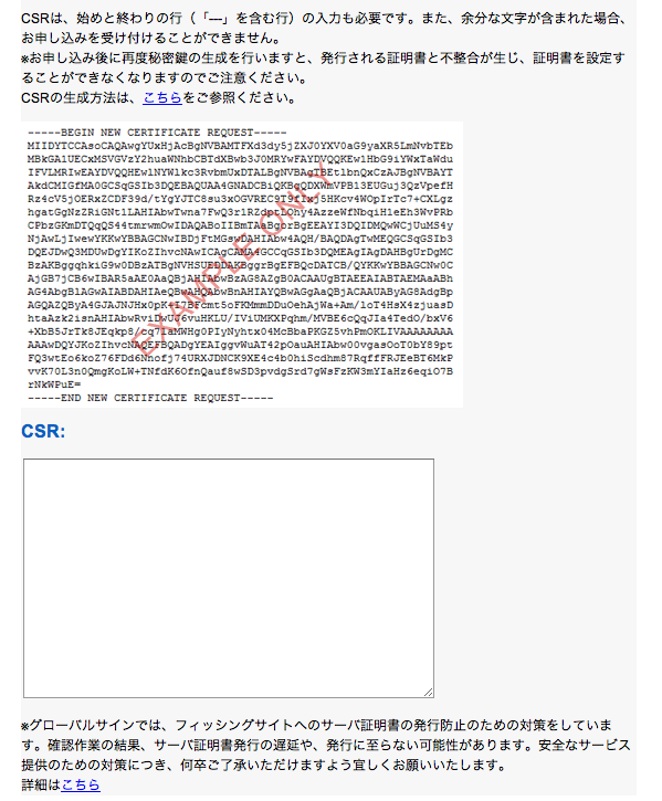 実際にグローバルサインを使ったことある人なら分かると思うんですけど、証明書の発行手続きを進めていると、そのうちCSRの入力画面が出て来るんですね。なので、そこでコピーしたCSRを入力します。