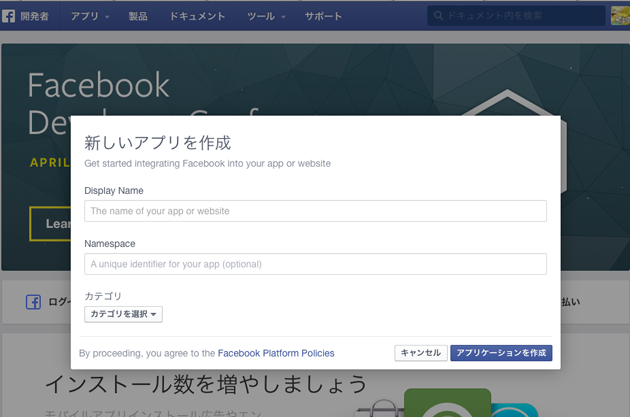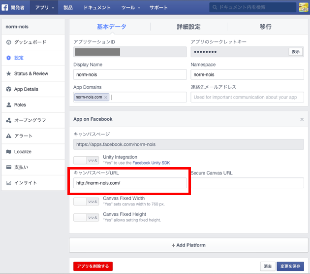 ちなみに、キャンパスページである「https://apps.facebook.com/***」の***の部分は、Namespaceを設定していればNamespaceが入り、Namespaceが未入力の場合は、アプリIDが入るようになっているみたいです。まあ、だからやっぱりアプリIDは別に隠す必要はなかったってことだよね、たぶん。
