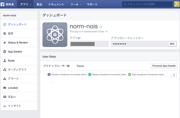 これがnorm-noisというアプリのダッシュボードですね。何か塗りつぶしちゃったけど、別にアプリIDは隠す必要なかったかしら?