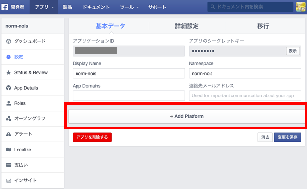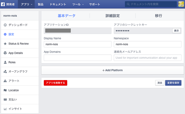 ここに表示されているアプリIDとアプリのシークレットキーは後でAPIを使うときに必要になるので、要チェックやで。シークレットキーの方は「表示」ってボタンを押せば見れます。「ほんとに見えてもええんか?」的なことを一度聞かれますけど。