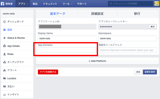ここで設定が必要なのは、画像の真ん中よりちょい上にある「App Domains」ってところ。