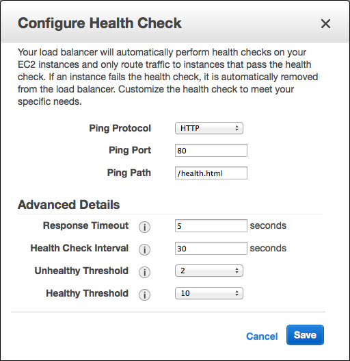 じゃあどうやってチェックしてるのかって話なのですが、AWSの場合(他の場合も同じかもしれないけど)、コンソール画面で設定しているヘルスチェック用のURLにアクセスできるかどうかで判断してます。そのURLからHTTPステータスの200が返ってくればOK。うっかり404とかが返って来ちゃうと、ロードバランサーの方で設定しているURLにアクセスしても、サイトが表示されません。