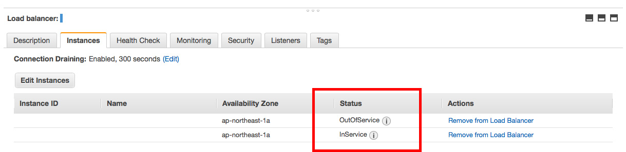 AWSの場合、ELBとEC2が正常につながっている場合は「InService」というステータスになります。上手くつながらない場合は「OutOfService」というステータスになる。これはコンソール画面で確認できます。