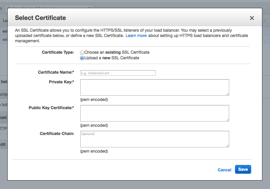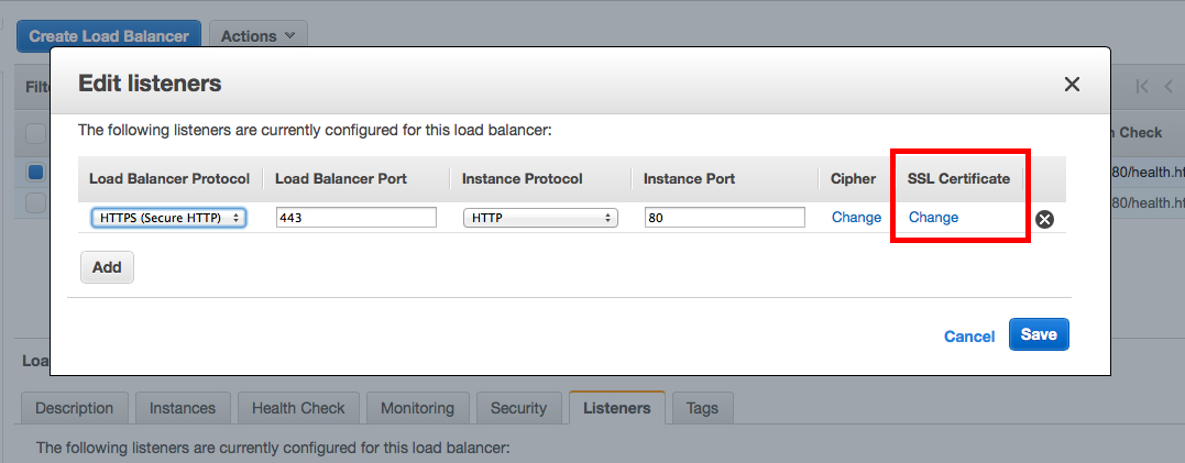 ELBの方をHTTPSにすると、右の方にある「SSL Certificate」ってとこに「Change」ってリンクが出て来ます。ここからSSLの証明書をインストールする画面を呼び出すことができます。