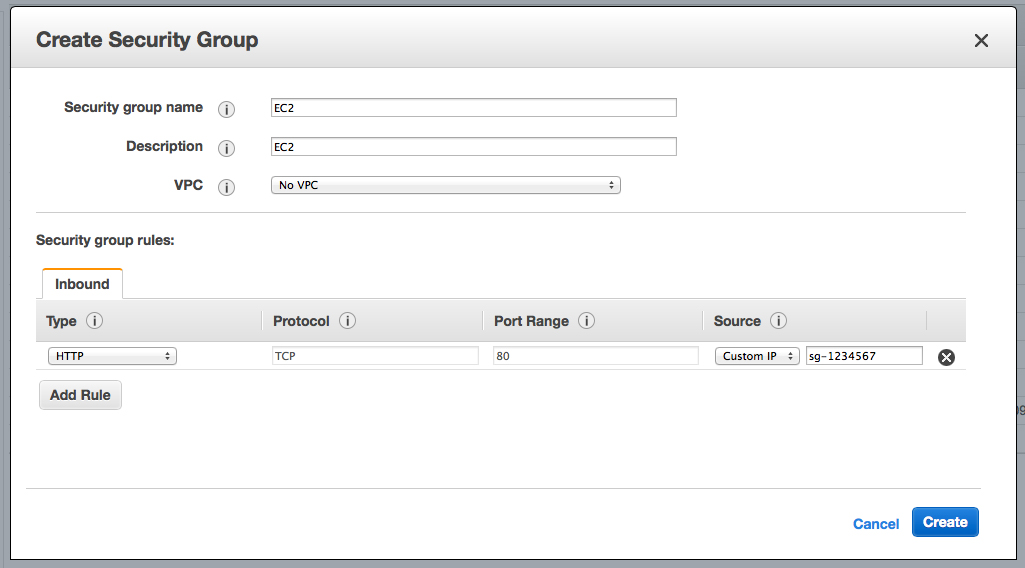 こっちはHTTP(80番ポート)を追加します。重要なのは、右の「Source」ってとこ。ここで「Custom IP」を選択し、先ほど作成したELB用のセキュリティグループのグループIDをここに入力します。上の画像で「sg-1234567」って入ってるとこですね。ここに任意のIDを入力する。セキュリティグループの一覧を見ると、Group IDのところに「sg-*******」みたいな文字列があるので、それをコピって入れます。