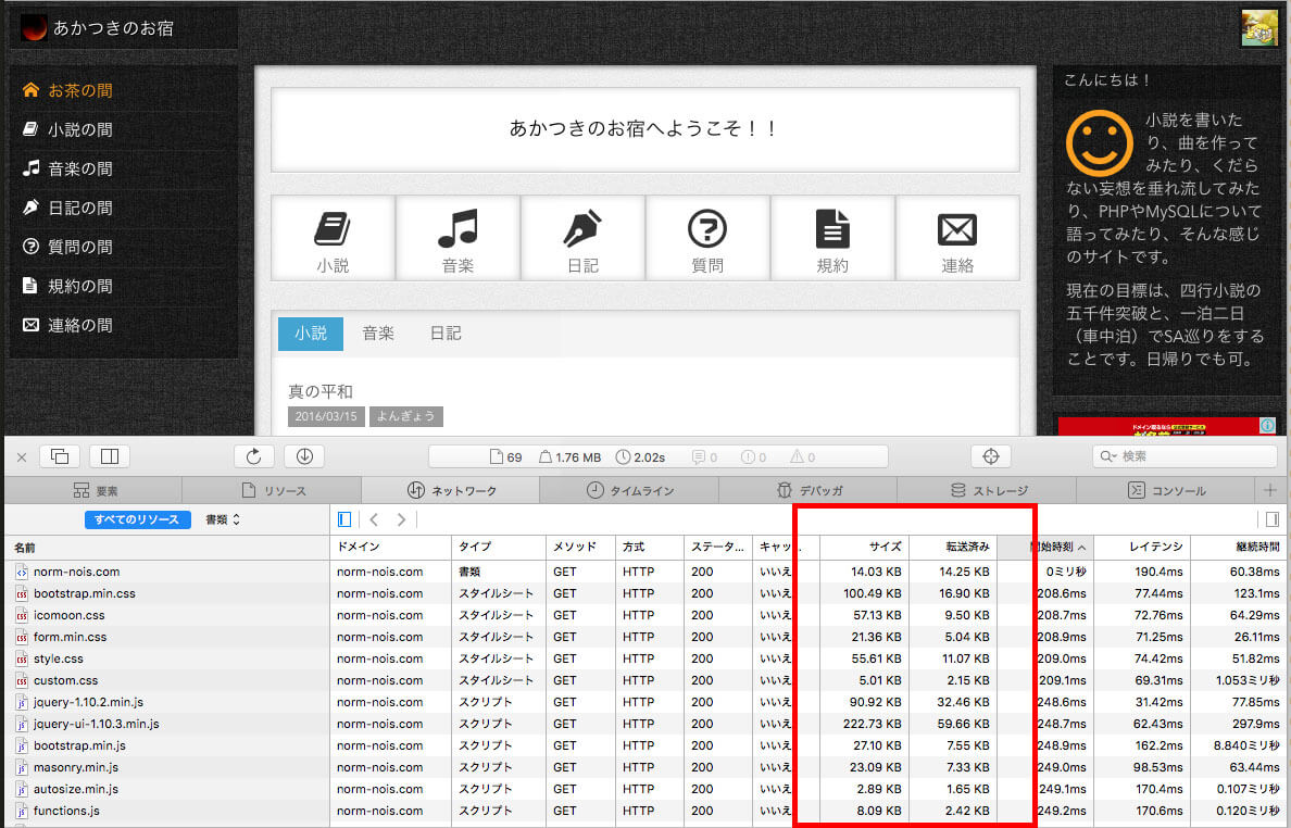 これで圧縮が有効になったはずなので、実際にブラウザでページを開いて確認してみると良いと思います。確認する方法はいろいろあるんですが、手っ取り早いのは、PageSpeed Insightsで分析するか、ブラウザの検証機能を使って見てみることでしょうか。一度キャッシュを消して、ページを読み込んでみれば、圧縮されたファイルが読み込まれているか分かります。