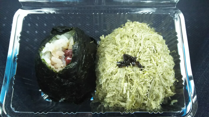 左はおにぎりだと予想がつくと思うのですが、右もおにぎりです。ノリの変わりにとろろでお米を包んであります。メニュー名はゴマ昆布とろろおにぎり。富山名物なんだそうです。左のおにぎりは、同じく富山名物であるホタルイカの沖漬けが入ってます。