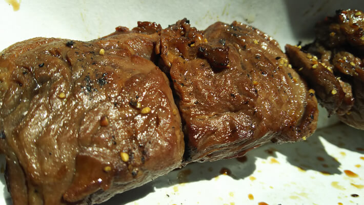 一本しか買わない辺り、ちゃんと自重してるっしょ? 前回牛串を買った時は、勢いでベーコン串も買いましたからね。この時点でお昼過ぎだったらもう一本くらい行ってたかもしれないけど、まだギリギリ午前中でしたからね。お昼ご飯には若干早いから、11時のおやつってことで。
