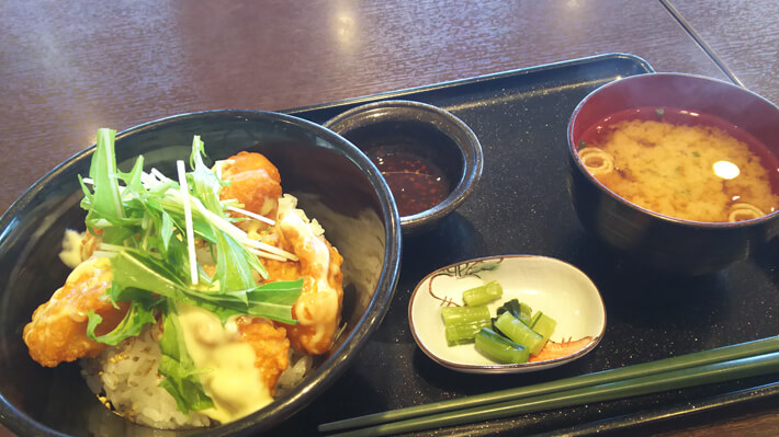 ご飯の上に乗ってるのは、鳥の唐揚げ……と言うか、何だろ……唐揚げとチキンナゲットの中間みたいな感じのものです。美味いです。