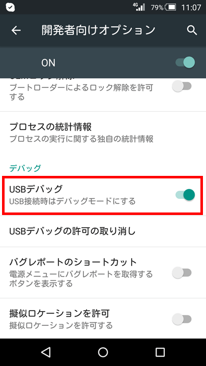 開発者向けオプションが表示されたら、その中の「USBデバッグ」を有効にします。