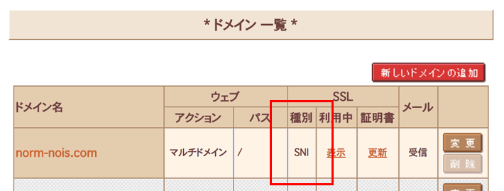SSLの設定が無事に完了するとコントロールパネルのドメイン設定のところがこんな感じになります。
