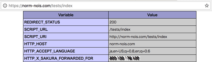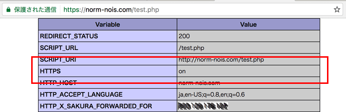 つまり多くの方が言っているHTTP_X_SAKURA_FORWARDED_FORでの判定が使えないってことです。念のため他のサーバー変数も一通り眺めてhttpとhttpsで違うものがないか確認してみたんですが、残念ながらありませんでした。