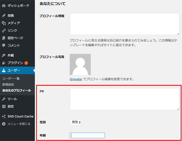 あなたについてのところに項目を追加する場合は「show_password_fields」と「profile_update」という二つのアクションフックが必要になります。「show_password_fields」でプロフィール編集画面に表示する項目を追加し、「profile_update」でデータの登録処理を行います。