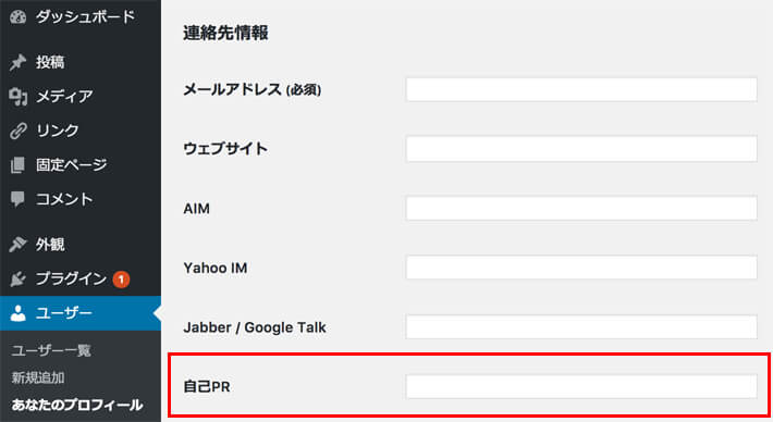 「user_contactmethods」というフィルターを使えば連絡先情報に項目を追加できます。実際にプロフィール編集画面を見てみると、自己PRを入力するテキストボックスが追加されていますね。