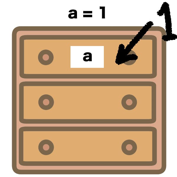 僕もちゃんと理解できてるか怪しいんであれですが……さっきのタンスの例で言うと、まず一段目の引き出しにaというラベルを貼って1を入れる。
