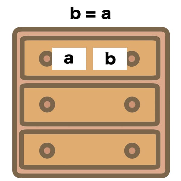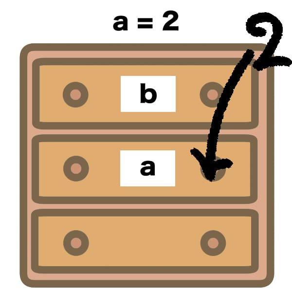 そんでもって次の「a = 2」は、二段目の引き出しに新たにaというラベルを貼り直して、そこに2を格納している……みたいなイメージだと思われます。だから一段目に貼られたbの方は特に変化しない。