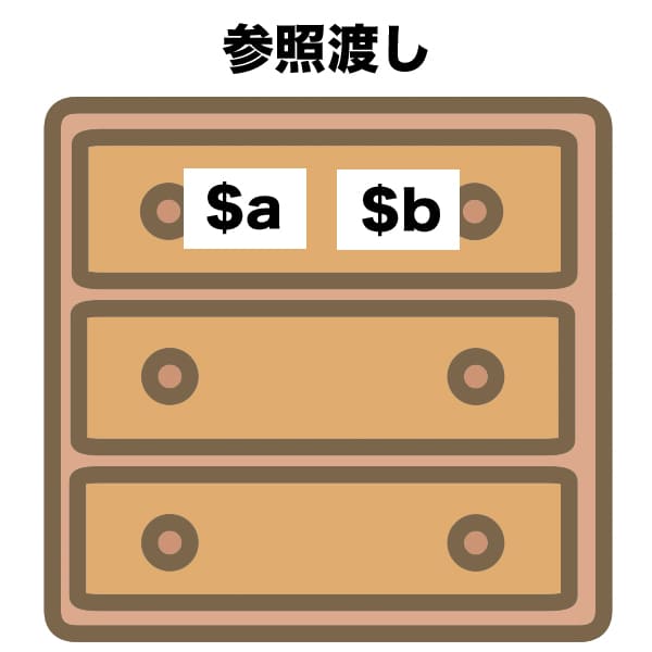 何だろう……例えばタンスの引き出しの一段目に$aというラベルを貼ったとして、二段目の引き出しに$bというラベルを貼って一段目の引き出しの中身をコピーするのが値渡しなのに対して、参照渡しの場合は$bというラベルも一段目に貼る、みたいな感じかな。だから常に中身が一緒になる、みたいな。余計分かりづらいか。すまん。