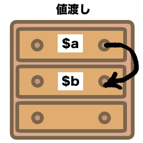値渡しというのは、値だけを渡すことです。文字通りの説明になってしまいますが、例えばこんなの(↓)が値渡しです。$a = 1