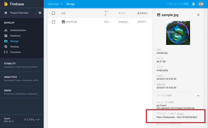 アップロードしたファイルのURLを取得するには「getDownloadURL()」というメソッドを使います。ref = firebase.storage().ref().child('sample.jpg');