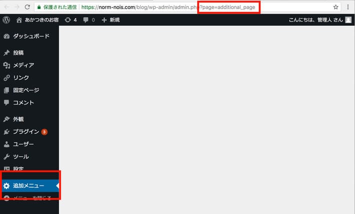 左側に「追加メニュー」という項目が増えていますね。画質を落としたのでちょっとぼやけて見づらいかもしれませんが、ページにアクセスするとURLのパラメータが「page=additional_page」と、引数で指定下通りのスラッグになっているのが分かりますね。これで追加メニューページを追加することができました。