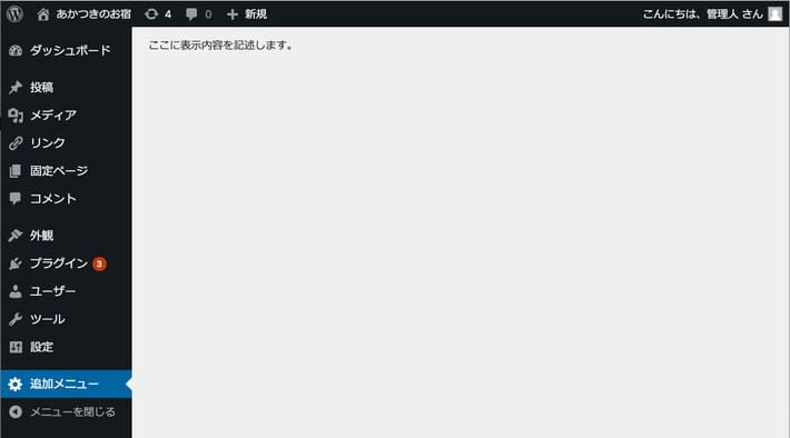 additional_menu_pageの中で「add_menu_page」という関数を使っていますが、これがメニューを追加する関数です。