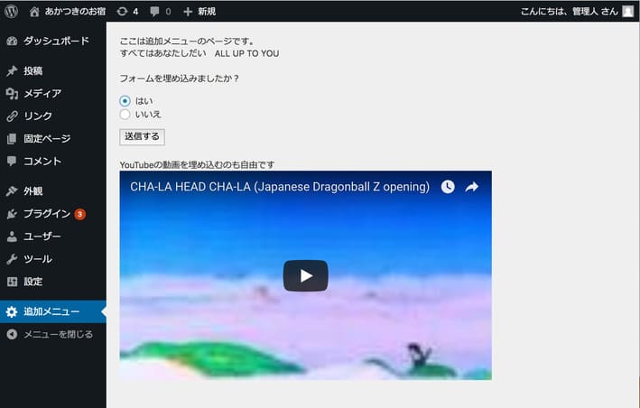 themesフォルダの中にadditional_page.phpというファイルを作ってフォームやYouTubeの動画を埋め込んでみました。こんな感じでページは好きにカスタマイズ可能です。