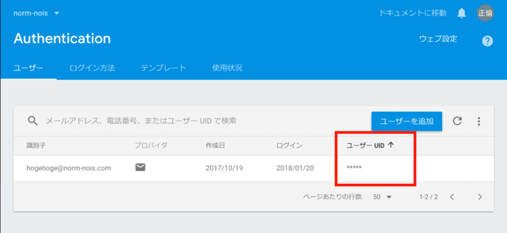 ユーザーUIDはAuthenticationのページで確認できます。