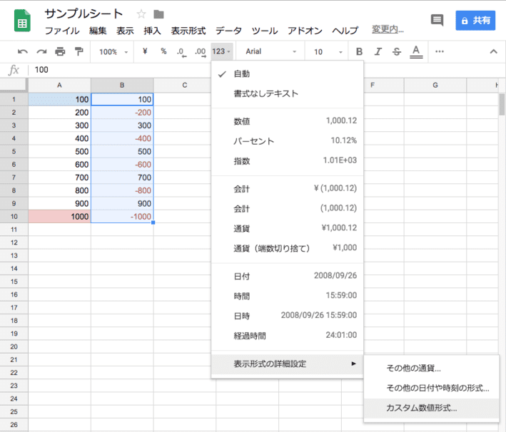 ここまでは特に難しい操作は必要ないのですが、もしも字の色を変えると同時にマイナスの符号も取っちゃいたいって場合。