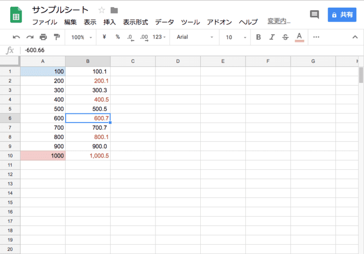 フォーカスが当たってるセル(B6)には「-600.66」という数字が入ってるのですが、マイナスの符号が消えて小数点第二位が四捨五入されてます。他も同様。