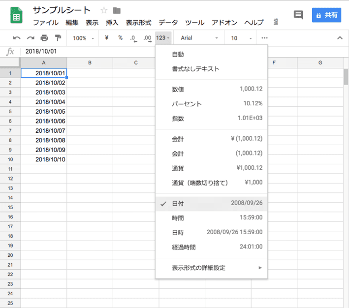 例えば「10/1」と入力するとスプレッドシートは今年の10月1日と判断をします。この辺はExcelとかも一緒ですが、この書式をいろいろといじりたい場合。「2018/10/01」のような表示にするのは簡単です。表示形式のところで日付を選択すれば良い。