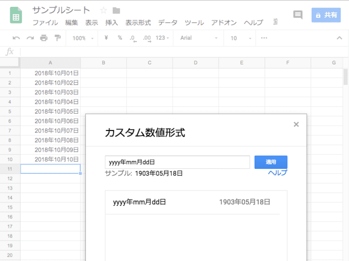 こんな感じですね。「yyyy」は年を4桁で、「mm」「dd」はそれぞれ月と日を2桁で表示するという意味です。2桁固定にしておくと1月とか2日のときに先頭に0がつきます。同じ要領で他の形式で表示することも可能です。「yyyy-mm-dd」で「2018-10-01」とかね。