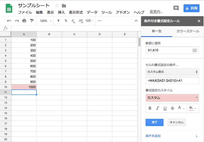 例えばこう書くとA1からA10の中で最大の数値が入ったセルだけ背景や文字の色を変えられる。反対に最小値の背景を変えたかったらMAXの代わりにMINを使えばオッケーです。