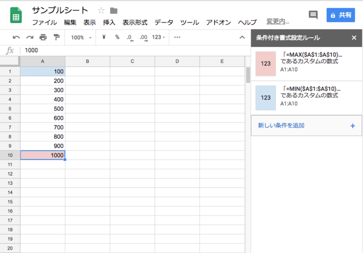 最小値のセルの背景が青、最大値のセルの背景が赤になっているのが分かると思います。