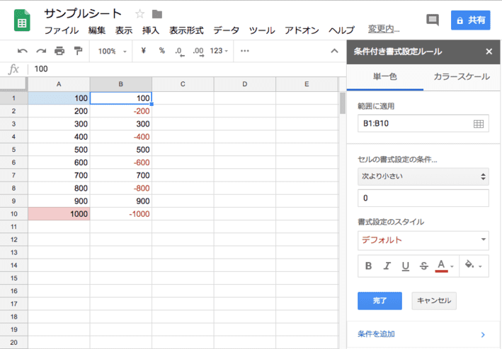 そういうときは条件付き書式ではなく、表示形式のカスタム数値形式で設定します。