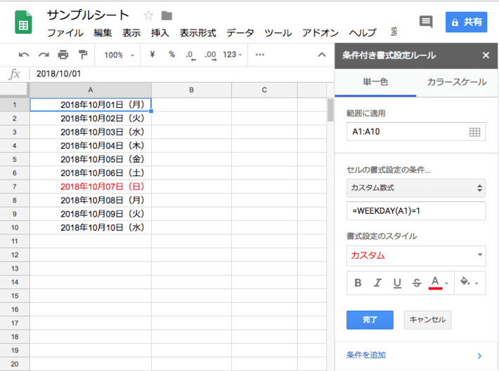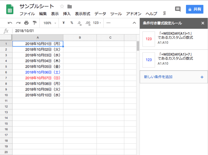 こんな感じです。「WEEKDAY()」という関数でセルに入力された日付の曜日を数字で取得できます。1が日曜で7が土曜。だから「=1」のところの数字を適当に変えれば他の曜日にもルールを指定することができます。