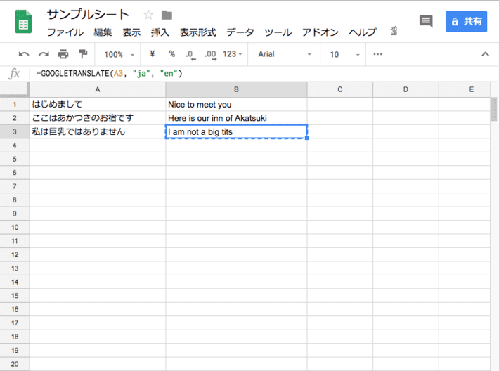 こうするとセルに入力された日本語を英語に翻訳してくれます。