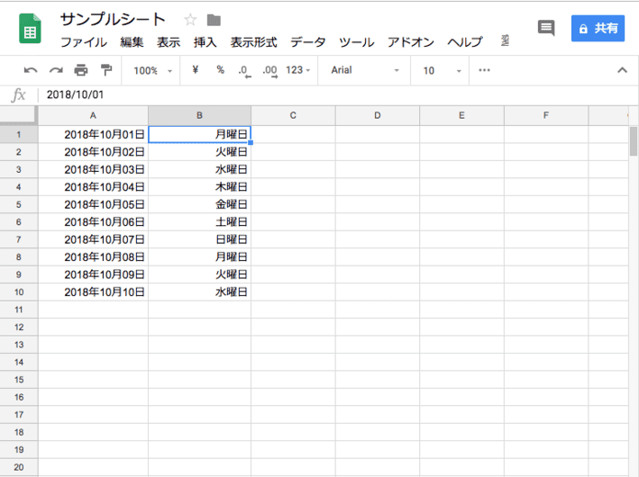 B1セルに「2018/10/01」と入力されてるけど表示が「月曜日」となってるの分かりますかね。B2からB10も同様です。