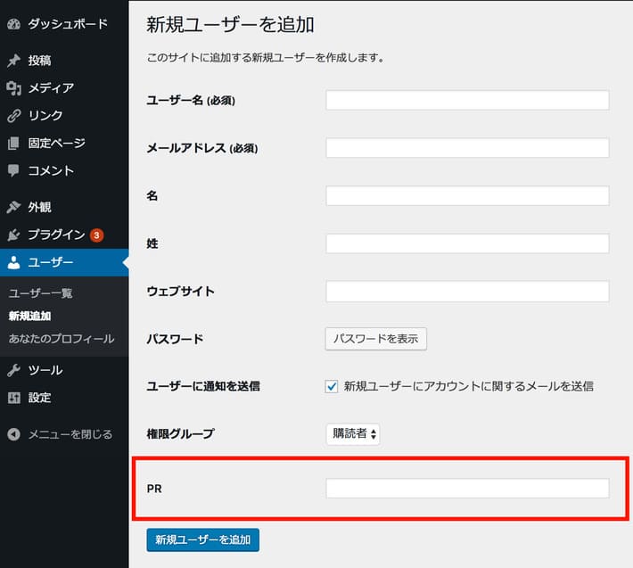 新規追加時にもPRのテキストボックスを表示するには、ここにさらに「user_new_form」というアクションフックを追加します。