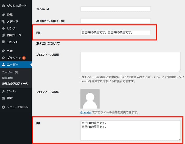 テキストボックスで項目を追加する場合は上記のやり方で簡単に実装できるのですが、それ以外の、例えばテキストエリアなどで項目を追加する場合はちょいめんどうです。というのも、連絡先情報はテキストボックスしか追加できないので、例えばPRの項目をテキストエリアで追加したい場合は、編集画面の「あなたについて」の方に追加する必要があります。
