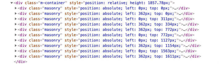 どうしてこうなるかって言うと、Masonryというのは各ブロック要素に対して絶対位置を割り当てるような処理を行なってるんですよ。