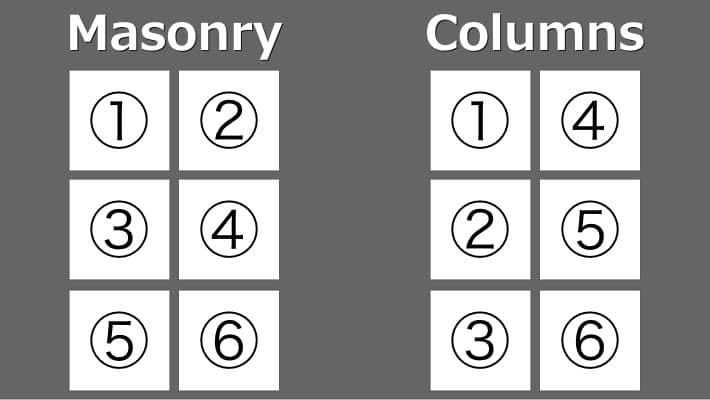 そのうちの一つが配置される順番です。Masonryとcolumnsではブロック要素の配置順が異なります。順番というか場所って言った方が良いのかな。