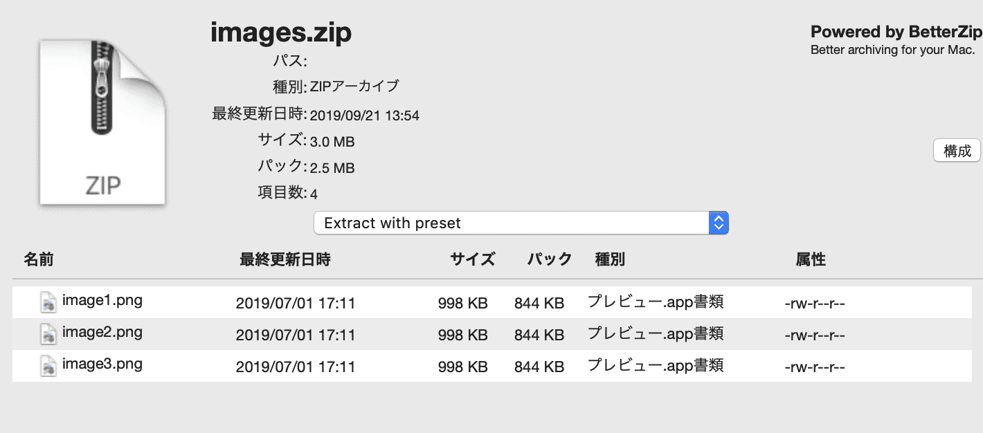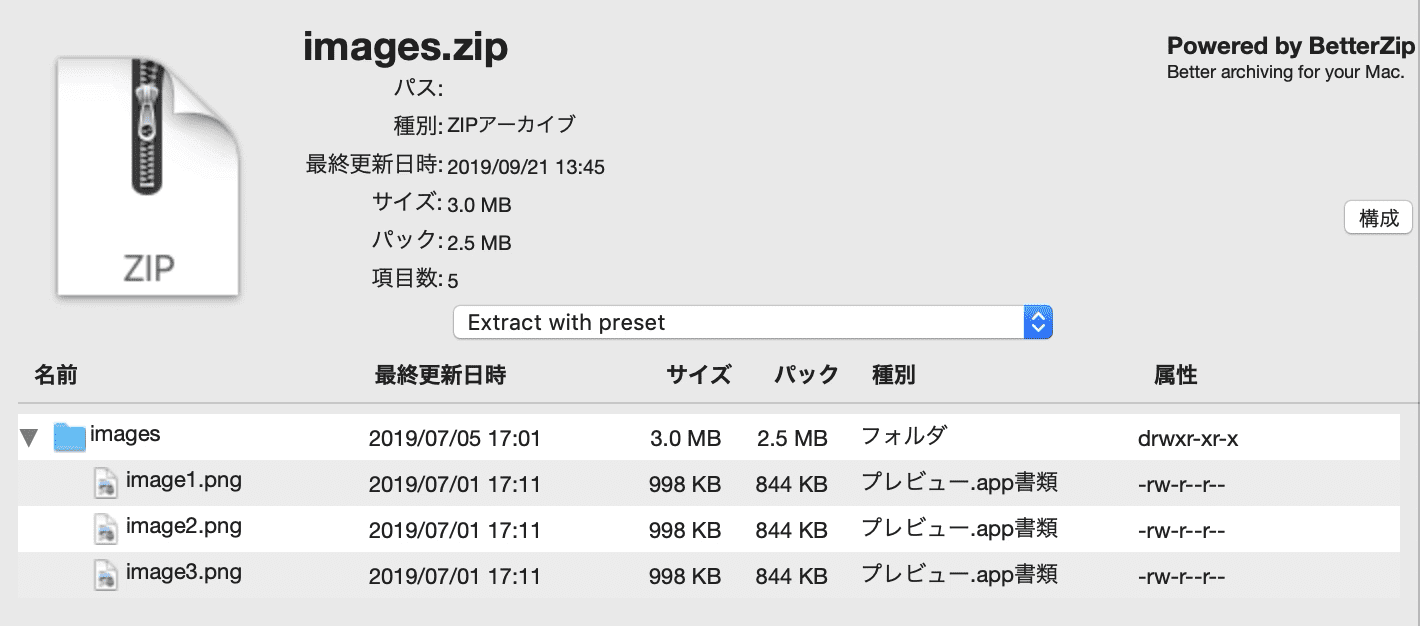 ちなみにこれはBetterZipと言ってzipファイルの解凍ソフトの一つなのですが、解凍せずにzipファイルの中身が見れたりするなかなか便利なやつです。解凍しなくても中身が確認できるって結構すごくない? スカートが風でめくれなくてもその中が見えたらとんでもないことじゃん? それを可能にするレベルのツールですよ、こいつは。