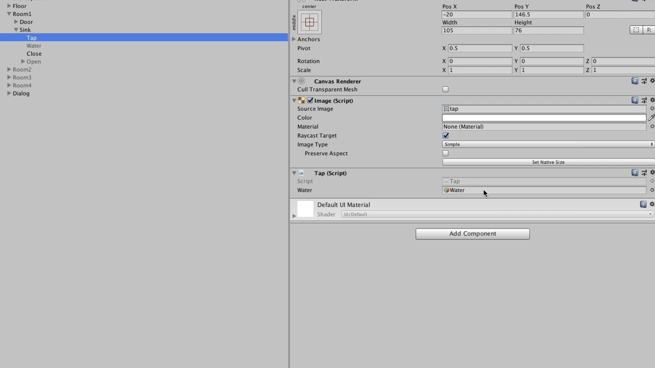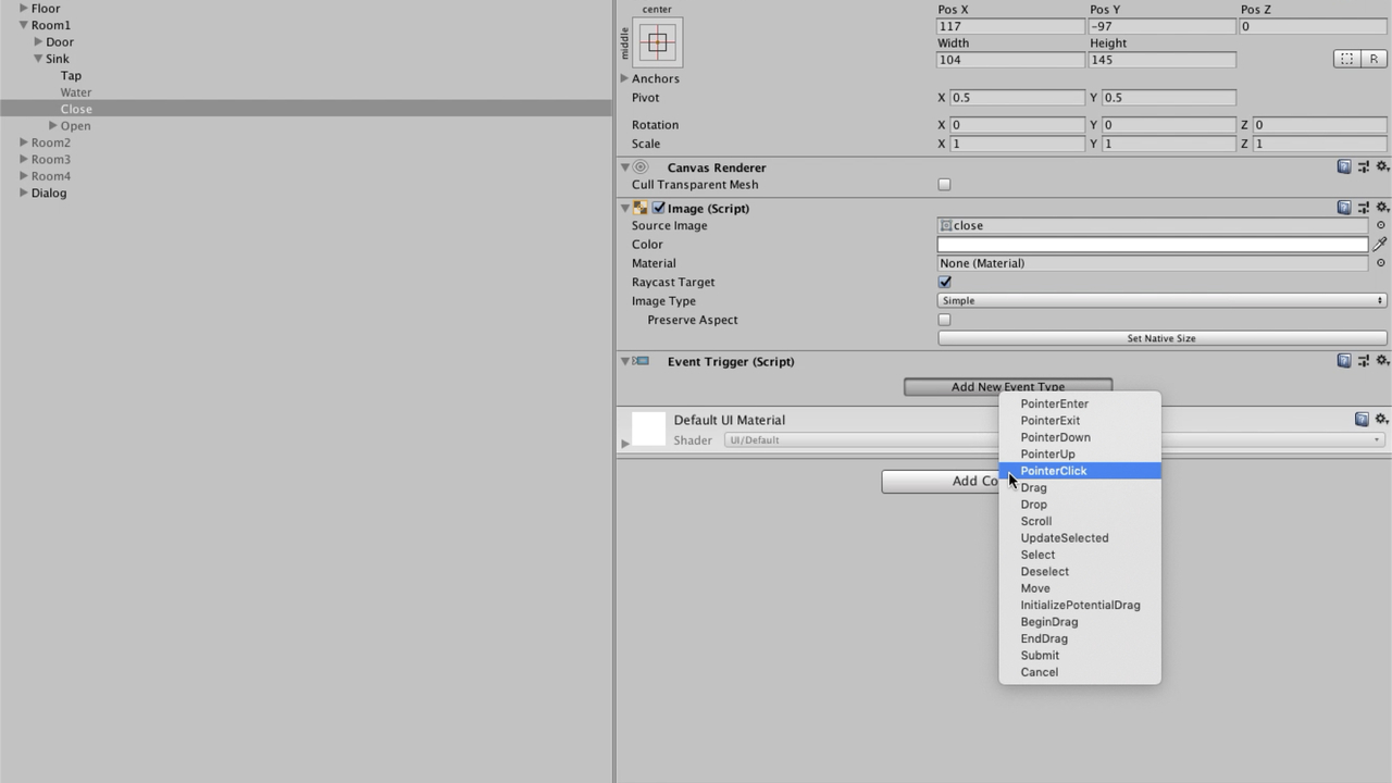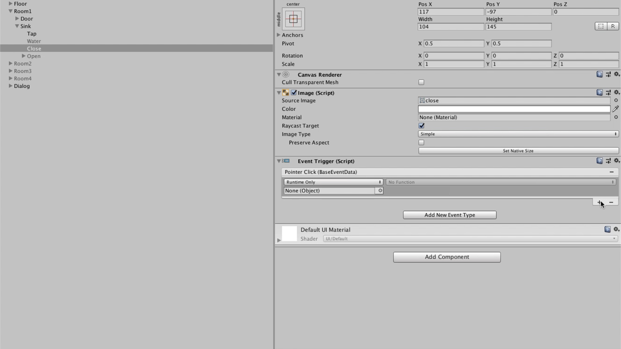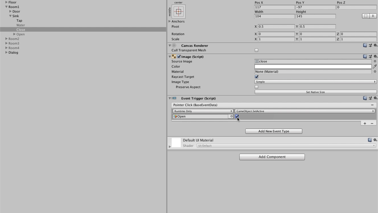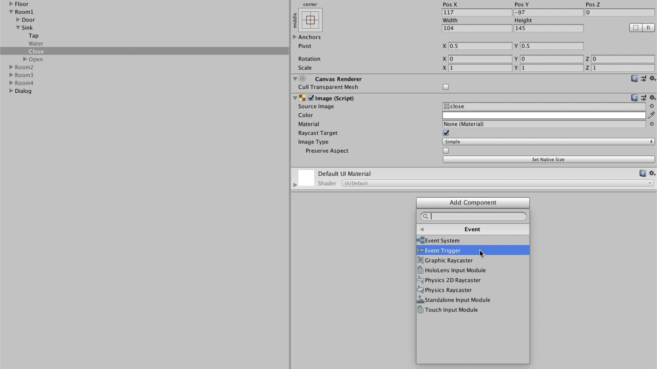 まずは閉じた扉の画像オブジェクト(Close)にクリックイベントをつけます。クリックイベントをつけるためには「Add Component → Event → Event Trigger」の流れでEvent Triggerコンポーネントを追加します。