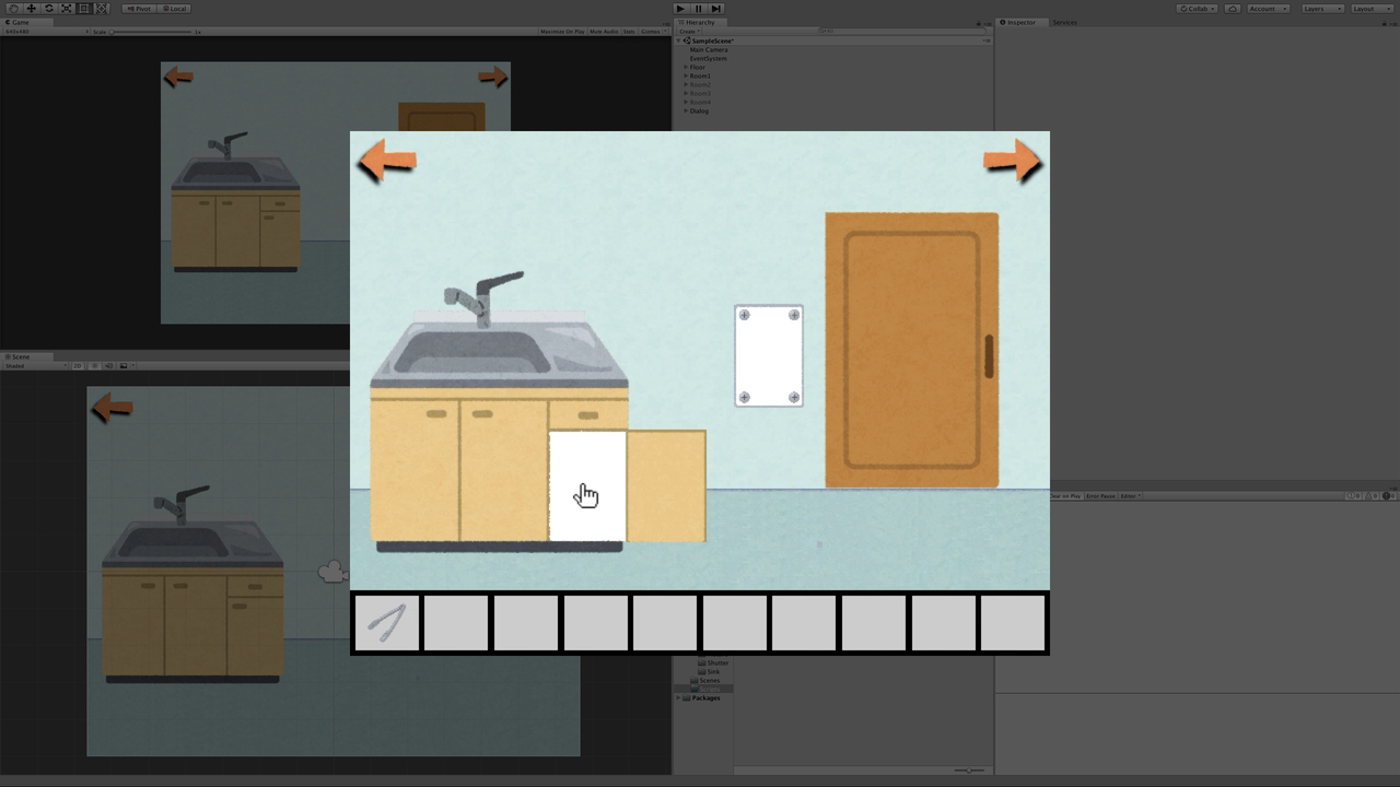 アクティブの操作はプログラミングが必要な場合とそうじゃない場合があるので、まずはスクリプトを書かなくても操作できる方法から見ていきましょう。本作の例で言うと、流し台の右下にある扉をクリックした時に扉が開いたり閉じたりする動きはコードを書かなくても実装できます。