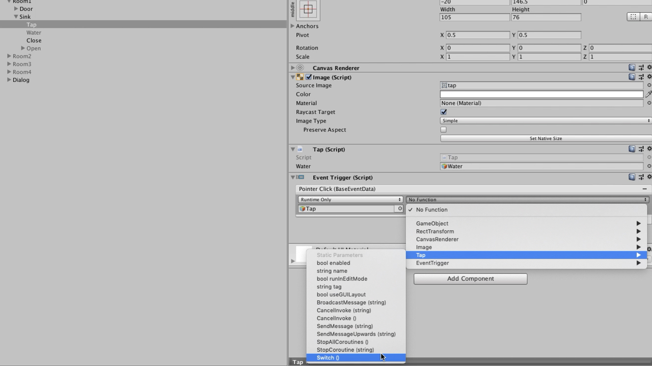 そして扉の開閉の時と同じようにクリックイベントのところにオブジェクトをセットします。ただしこの時セットするのは操作対象のオブジェクト(水オブジェクト)ではなく、スクリプトを追加したオブジェクトです。動画では蛇口オブジェクト(Tap)にスクリプトを追加しているので、Tapオブジェクトをドラッグ&ドロップします。すると関数一覧のプルダウンの中に追加したTapスクリプトが出てくるので、そこからSwitch関数を選択することができるようになります。