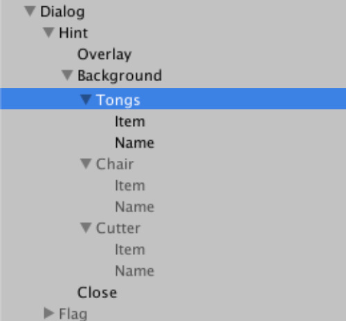 Hintオブジェクトは画面をまとめて扱うための空オブジェクトで、OverlayやBackgroundがアイテム詳細画面の背景、TongsやChair、Cutterなどがその画面内に表示するためのアイテムオブジェクトです。それぞれの中にはアイテムの画像オブジェクト(Item)とアイテム名のテキストオブジェクト(Name)が入っています。Closeは閉じるボタン。